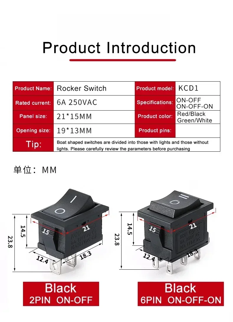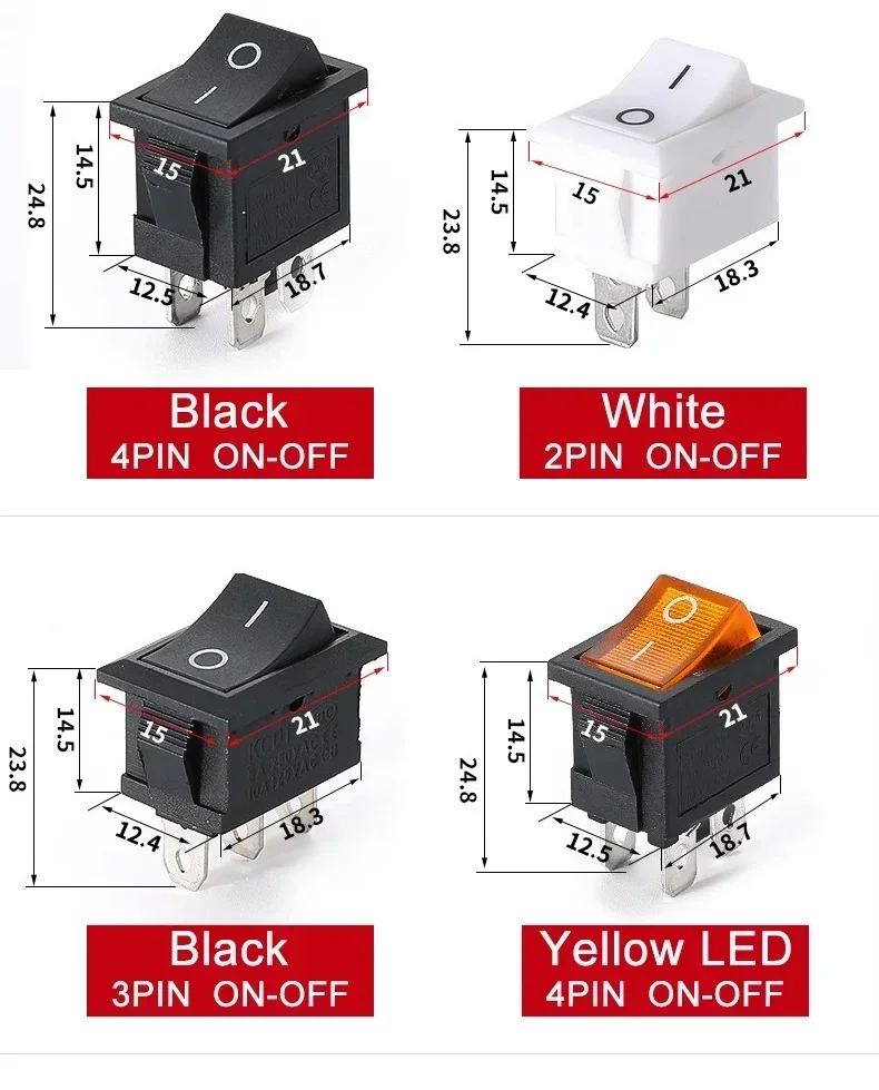 10/30/100 Pcs KCD1 Snap – in Boat Rocker Switch – SPST ON – OFF, 2/3/4 Pin, 250V 6A (AC) / 125V 10A, 2P Toggle Power Snap Switch