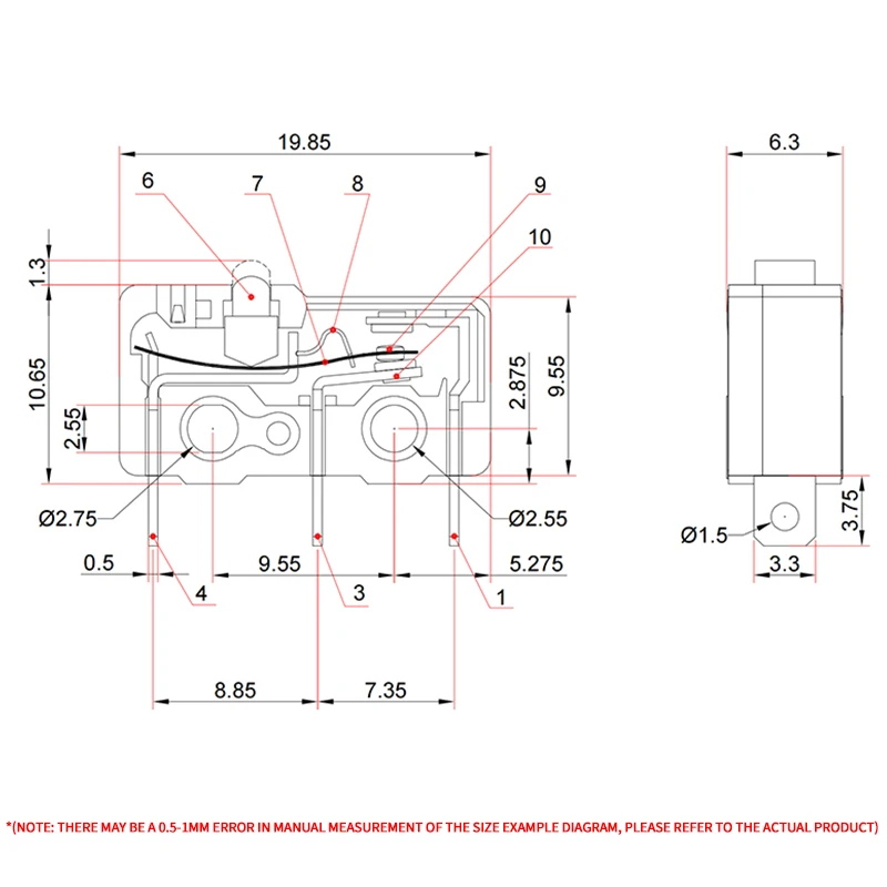 Mounting Dimensions (L x W x H): 19.85 x 10.65 x 6.3 mm (Often combined with Overall Dimensions if identical)
