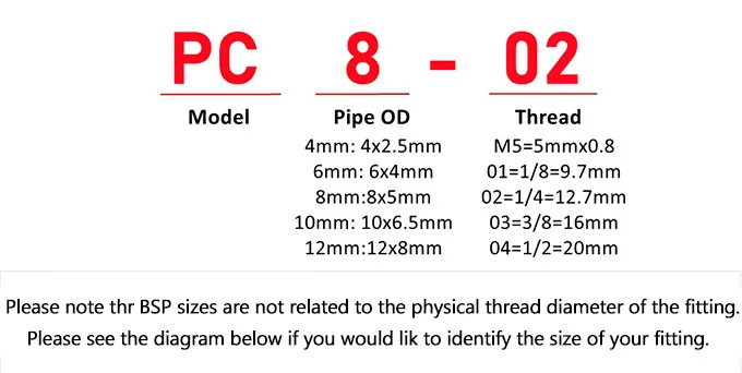 Male Thread Size: M5 " , 1/8", 1/4", 3/8", 1/2"BSPTFit For Tube Outer Diameter: 4mm 6mm 8mm 10mm 12mmTips:01=1/8" Threaded≈9.7mm02=1/4"