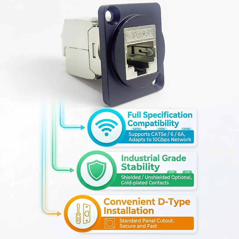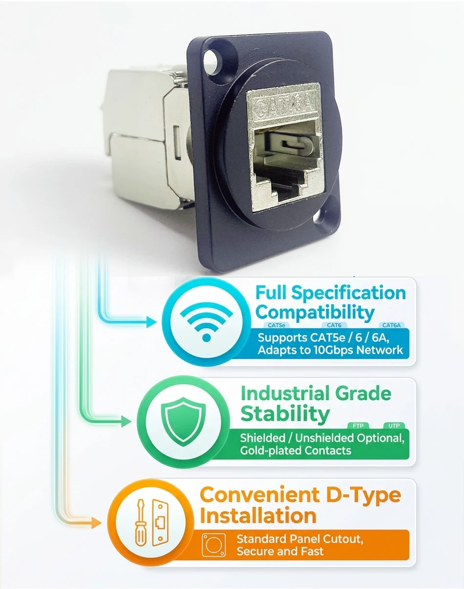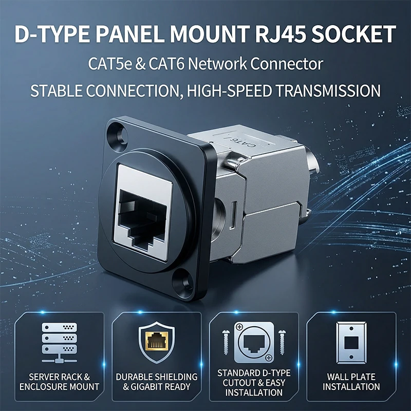 D-Type Panel Mount RJ45 Socket, CAT5e CAT6 Ethernet Network Connector for Wall Plate, Server Rack and Enclosure