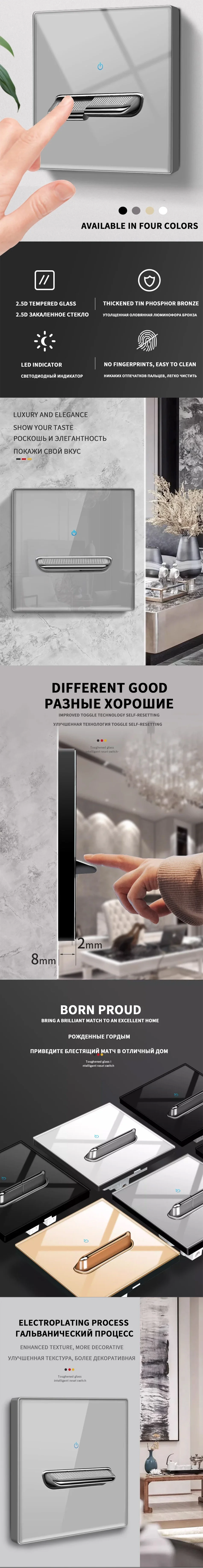 Be the first to review “European British French Standard Tempered Glass Switch Socket with Indicator Light , Self-Reset 1 2 3 4 Gang Wall Panel Outlets”