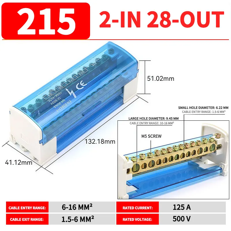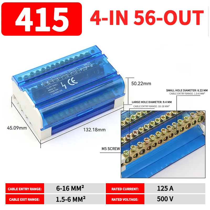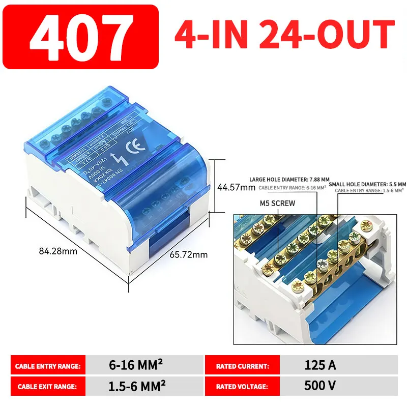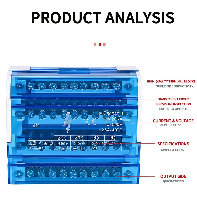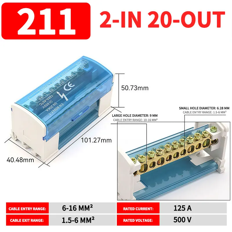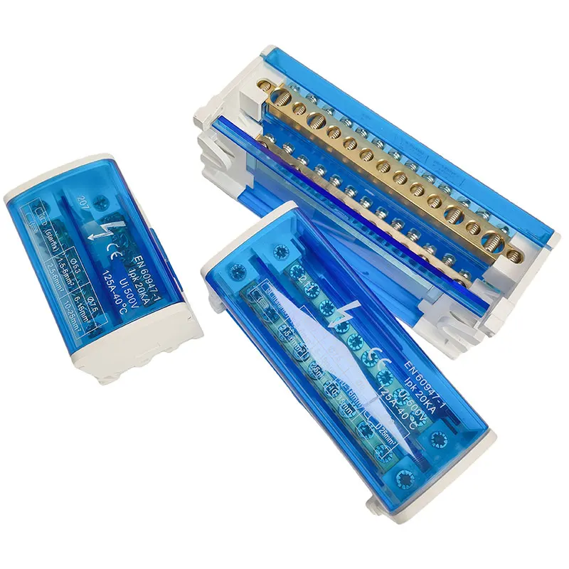 UK207/211/215/407/411/415 DIN Rail Terminal Block, 125A Distribution Box 1/2 In Several Out, Electrical Junction Box