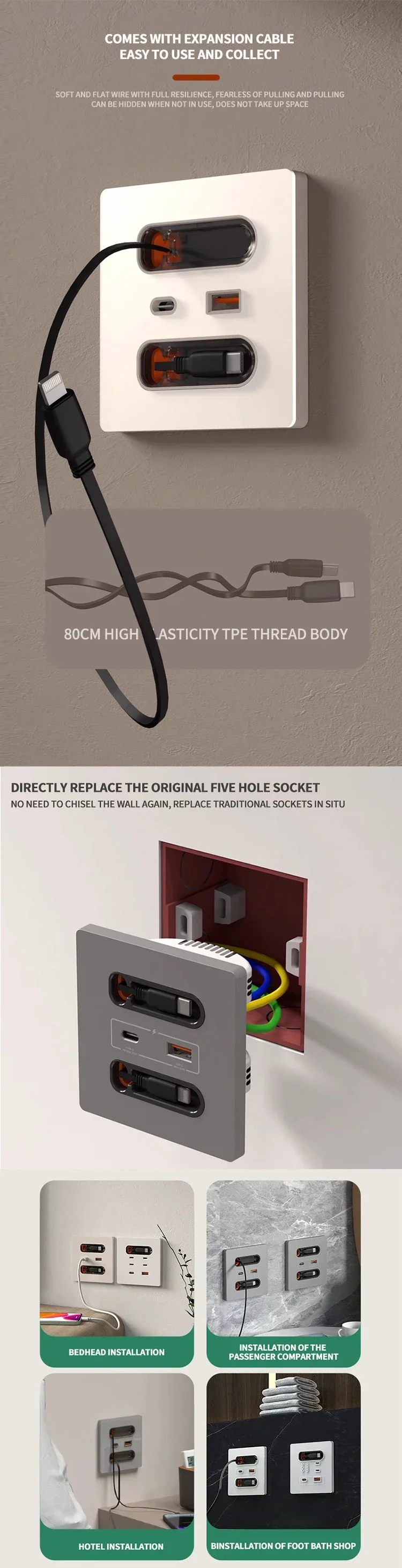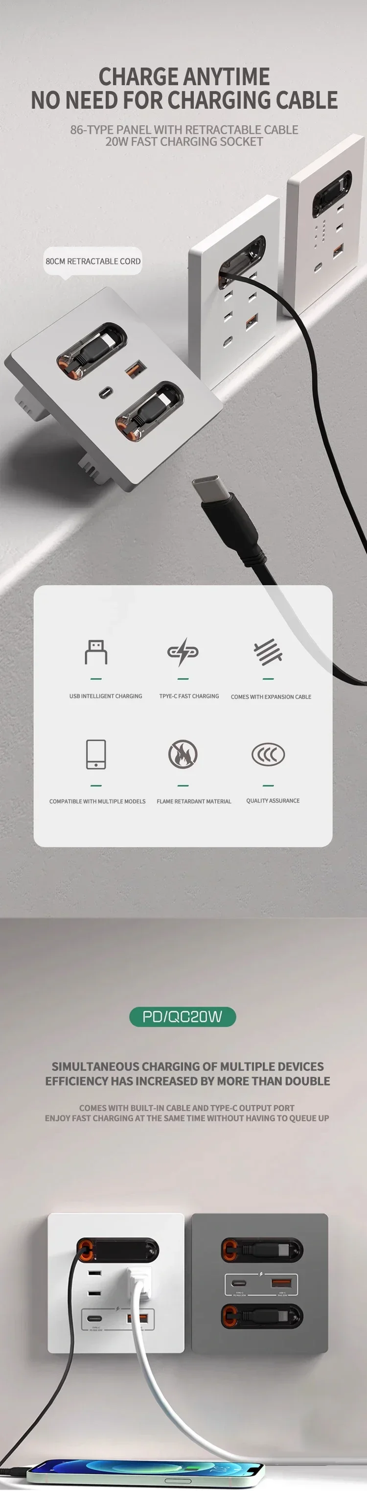 Universal Wall Socket 86-Type White With Retractable Wire Data Cable 20W Fast Charge Type-C PD USB Fast Charging for iPhone