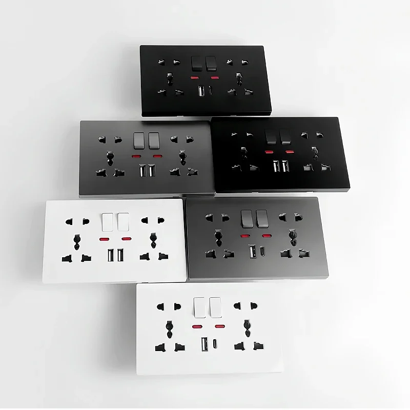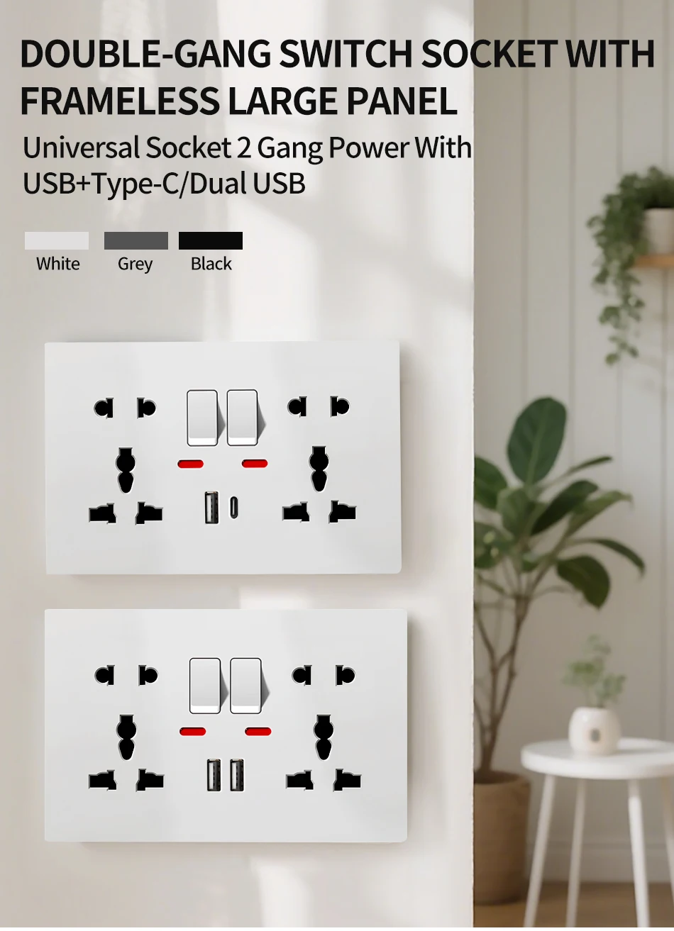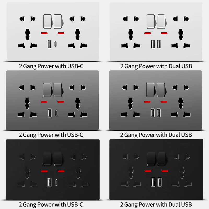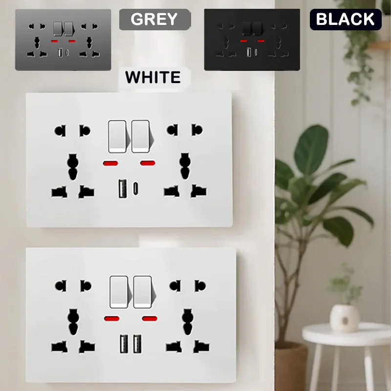 Universal Wall Socket with USB-C USB Charger & Switches, 2 Gang Power Outlet With LED, Flush Mount, AC 110-250V